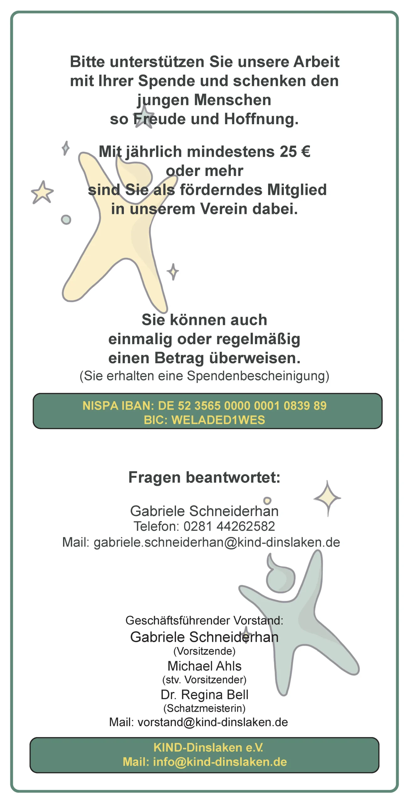 Möchten Sie mehr über KiND-Dinslaken e.V. und unsere Arbeit für Kinder und Jugendliche erfahren? Nehmen Sie gern Kontakt mit uns auf! Wir freuen uns über jedes Interesse, jede fördernde Mitgliedschaft und jede Spende, die unsere Projekte möglich macht. Gemeinsam können wir viel bewegen – für die Zukunft unserer Jugend in Dinslaken.
