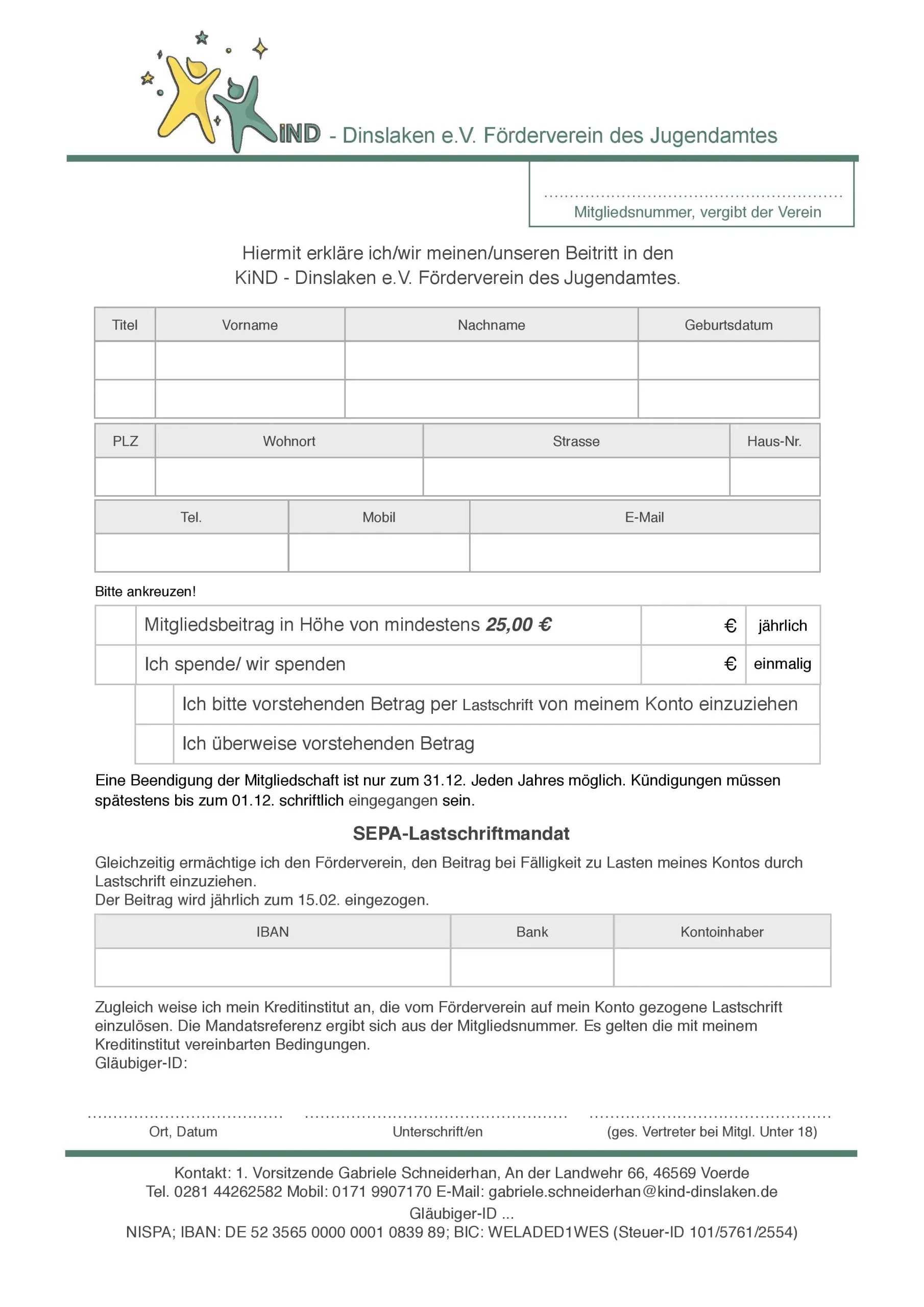 Möchten Sie mehr über KiND-Dinslaken e.V. und unsere Arbeit für Kinder und Jugendliche erfahren? Nehmen Sie gern Kontakt mit uns auf! Wir freuen uns über jedes Interesse, jede fördernde Mitgliedschaft und jede Spende, die unsere Projekte möglich macht. Gemeinsam können wir viel bewegen – für die Zukunft unserer Jugend in Dinslaken.